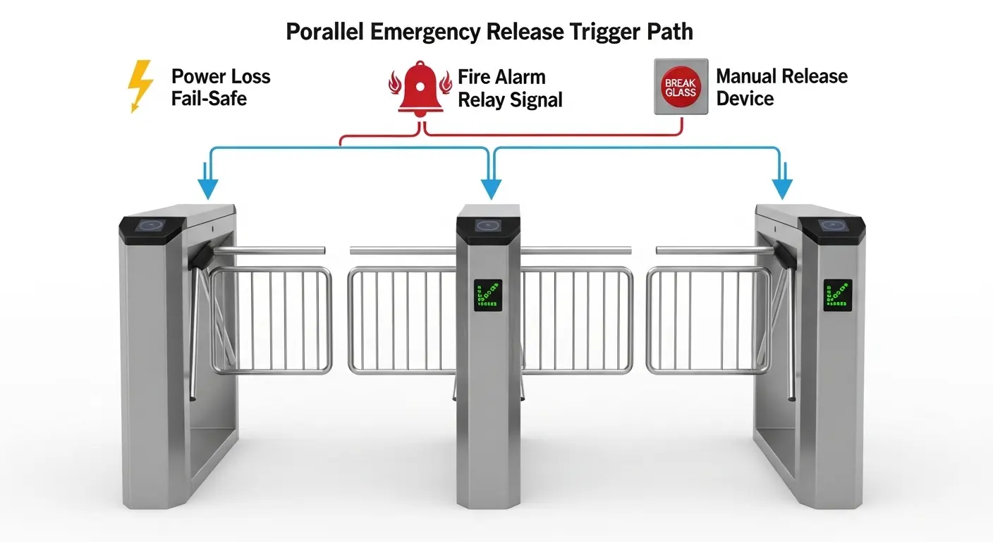 Een noodontgrendelingspoort is een poort die zo is ingesteld dat hij zijn barrières direct opent tijdens een noodgeval — zonder dat een bewoner een legitimatie hoeft te tonen, Bedien een sleutel, of een speciale actie ondernemen. Elke bouwverordening die de toegangscontrole voor voetgangers op een uitgangspad regelt, vereist deze mogelijkheid. De exacte mechanismen, Triggermethoden, en het gedrag van de poort verschilt per producttype en lokale jurisdictie — en het verkeerd weergeven van de specificatie zorgt voor een fout in de levensveiligheidsnaleving die pas bij een daadwerkelijke noodsituatie optreedt.