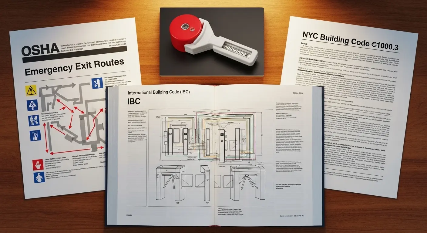 De Amerikaanse Internationale Bouwcode (IBC) en OSHA's 29 CF 1910.36 Beide vestigen hetzelfde kernprincipe: Elke medewerker of bewoner moet te allen tijde via een draaipoort op een uitgangspad naar buiten kunnen gaan, zonder sleutel, werktuig, of speciale kennis. NYC Building Code §1010.3 strekt dit verder uit — en bepaalt dat de uitbraakkracht die nodig is om een draaipoort handmatig te overrulen in een noodgeval niet mag overschrijden 13 Ponden (57.8 N), dat de poort volledig open moet komen tot de volledige open breedte, en dat een handmatig ontgrendelingsapparaat aan de uitgangszijde van elke rijstrook moet worden geplaatst.