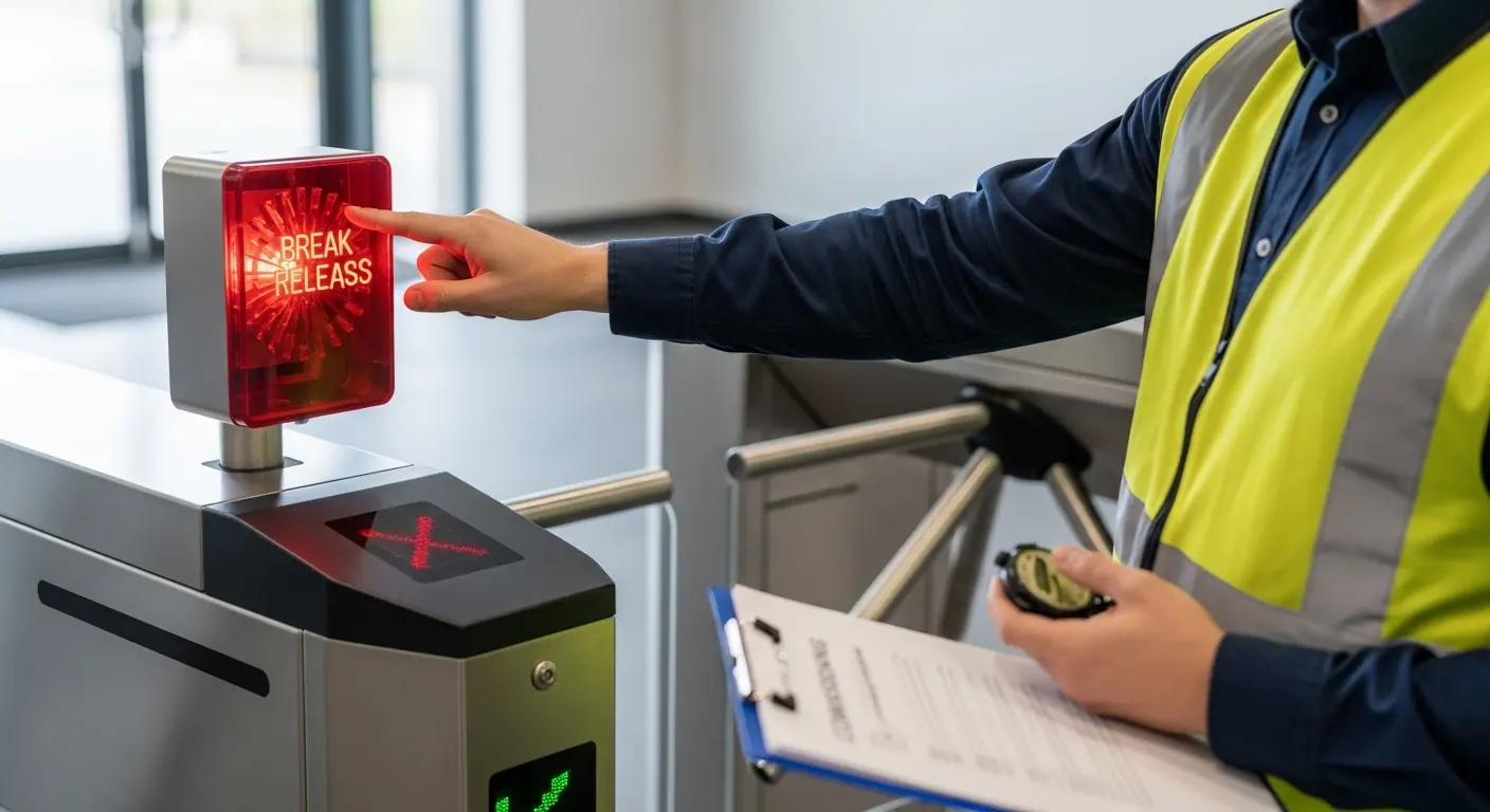 Een conforme noodloslatingsdraaipoort moet op alle drie de triggerpaden worden getest voordat de installatie wordt afgetekend. Het testen van één pad is niet voldoende — elke trigger werkt via een ander circuit, en een fout in het ene pad beïnvloedt de andere niet:
